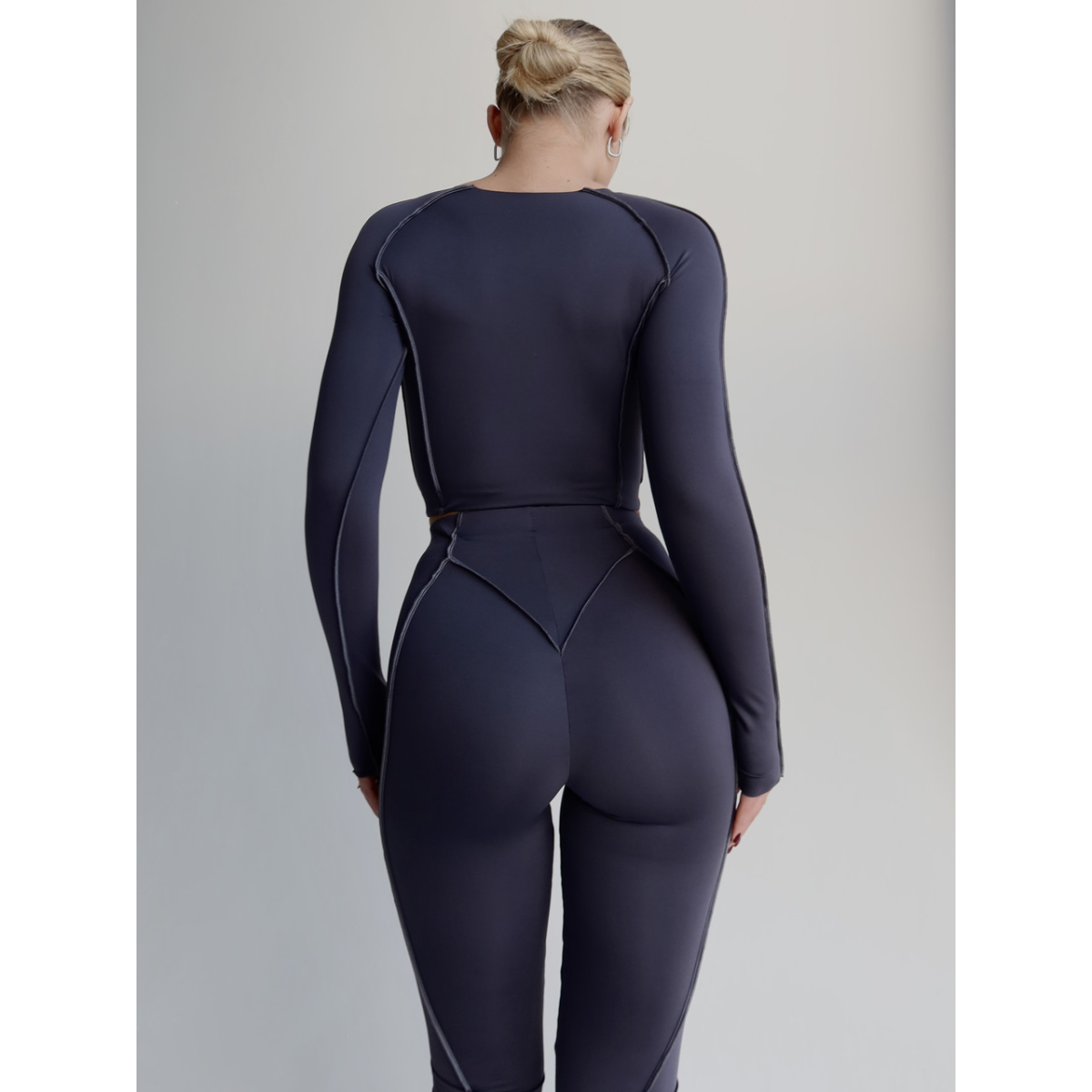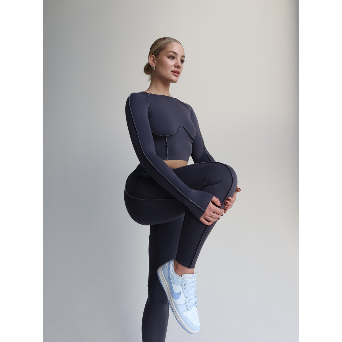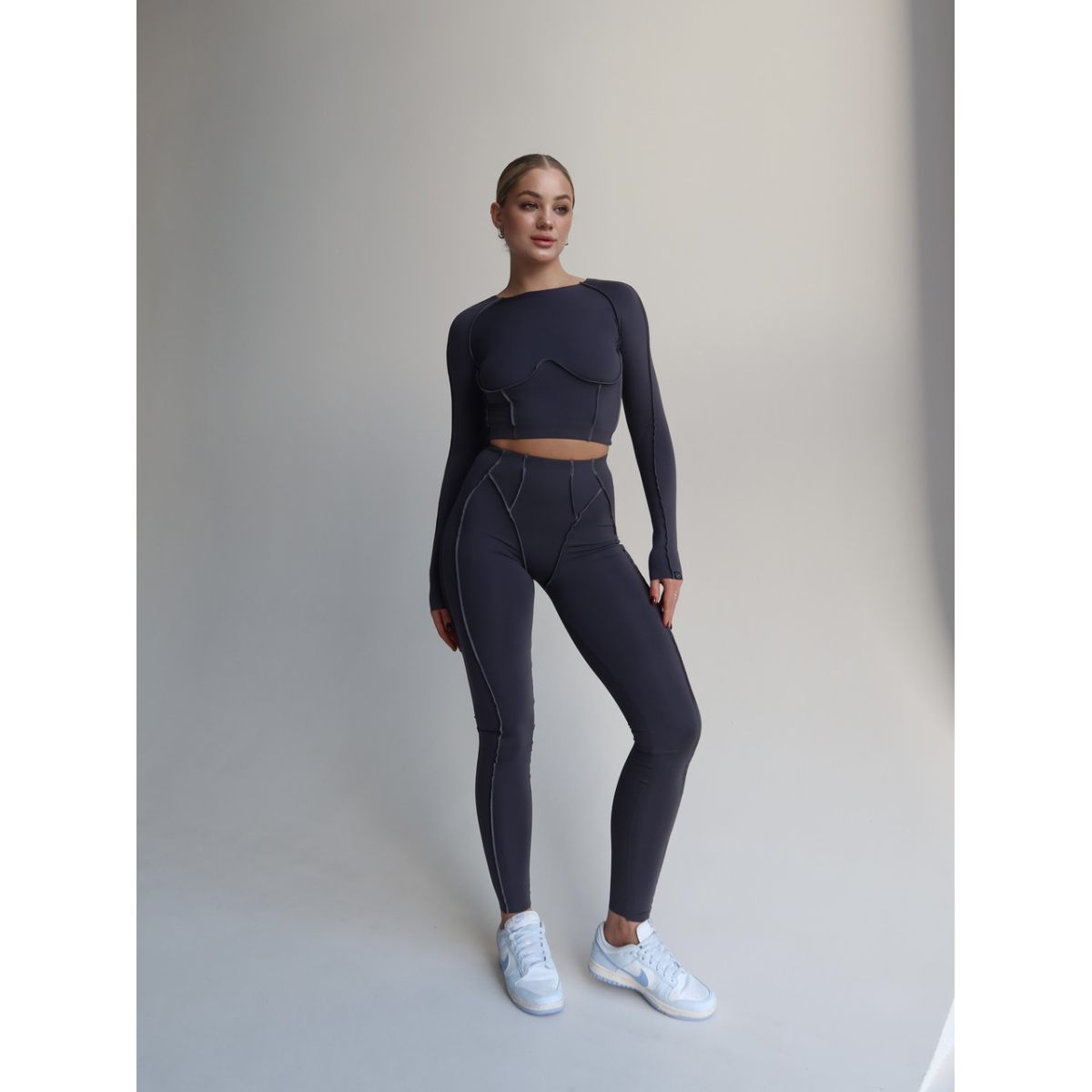 Стильний комплект для різних видів спорту. Легінси середньої посадки та кроп-топ декоровані зовнішніми швами. М'яка, гладка, швидковисихаюча тканина.