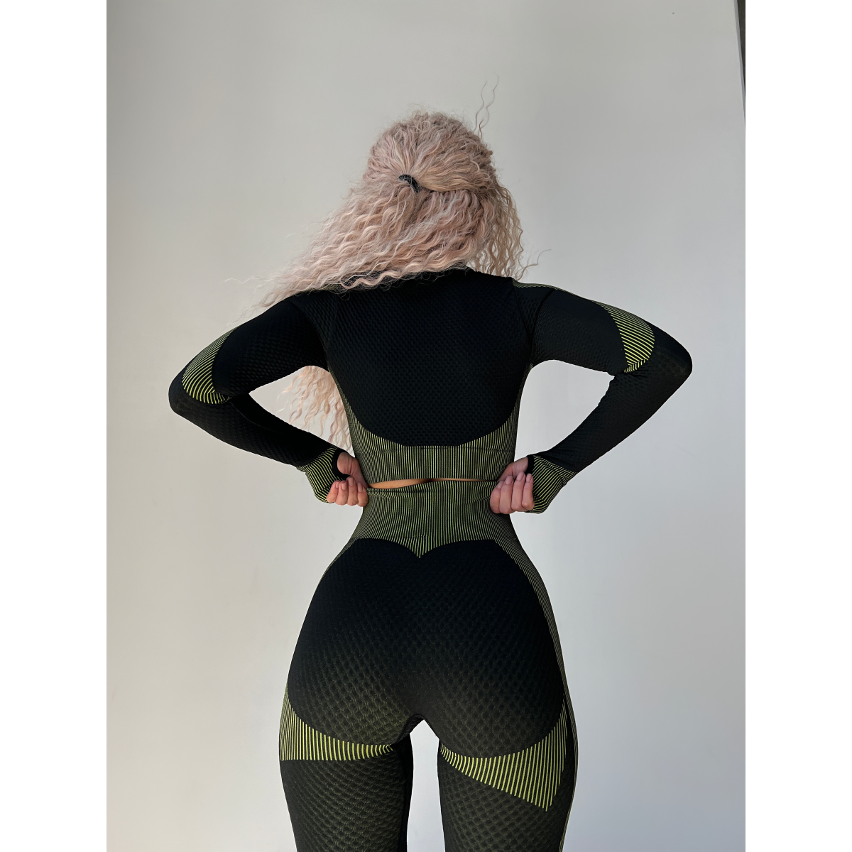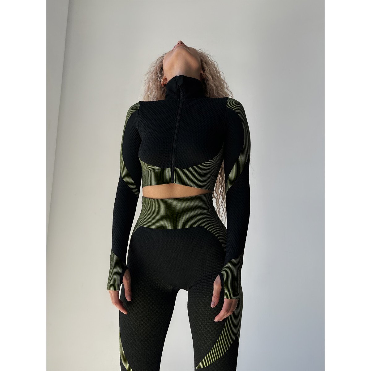 Висока посадка легінсів тримає лінію талії, рашгард на блискавці фіксується зручно й не перекручується, а бра підтримує форму грудей без тиску. Цей комплект створений для руху, стабільності та впевненості у власному тілі.
