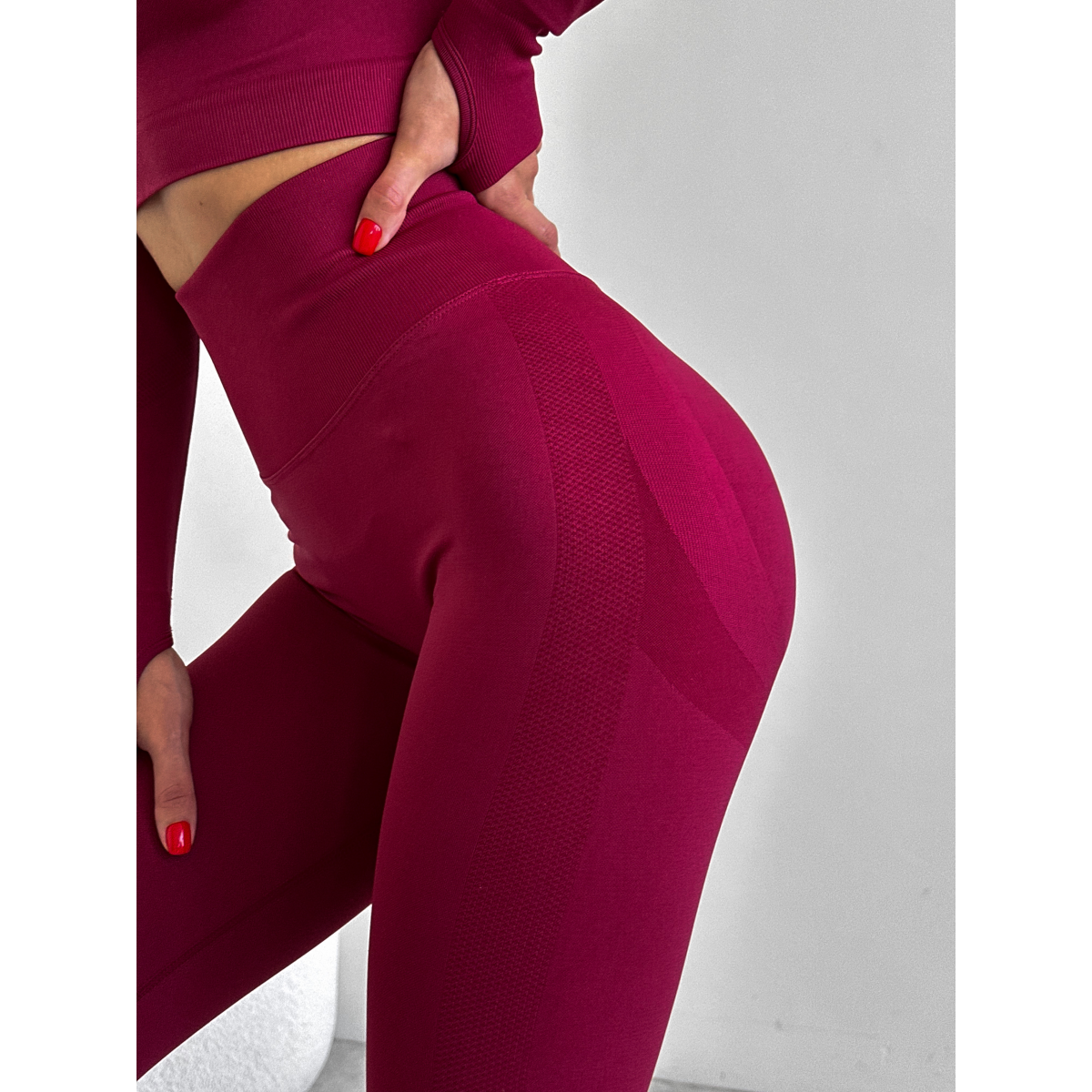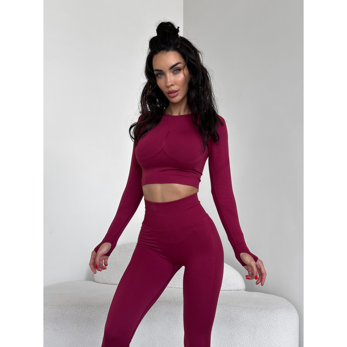 Безшовний комплект спортивний лосини з подвійним push up і топ лонгслів без чашок бордовий Rise