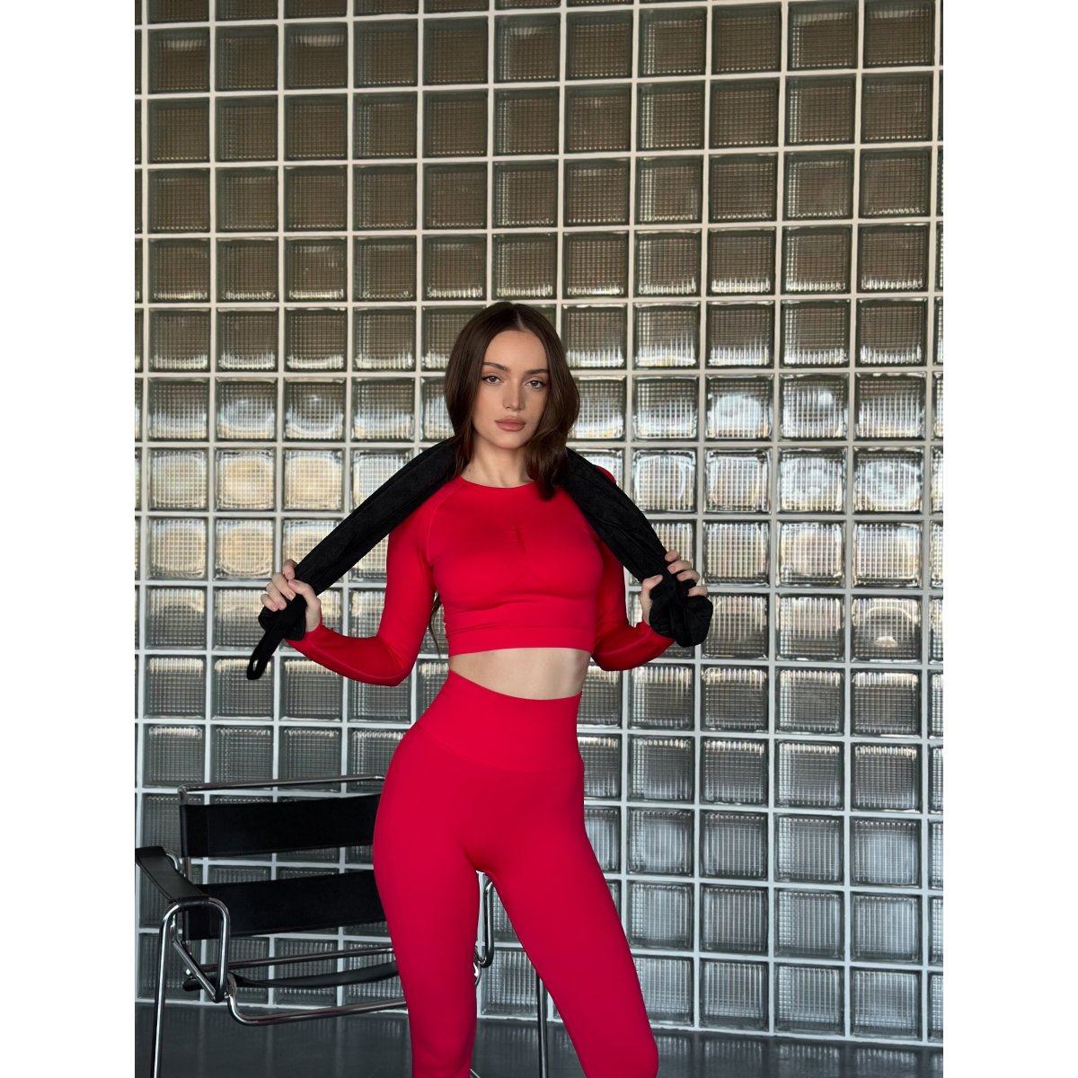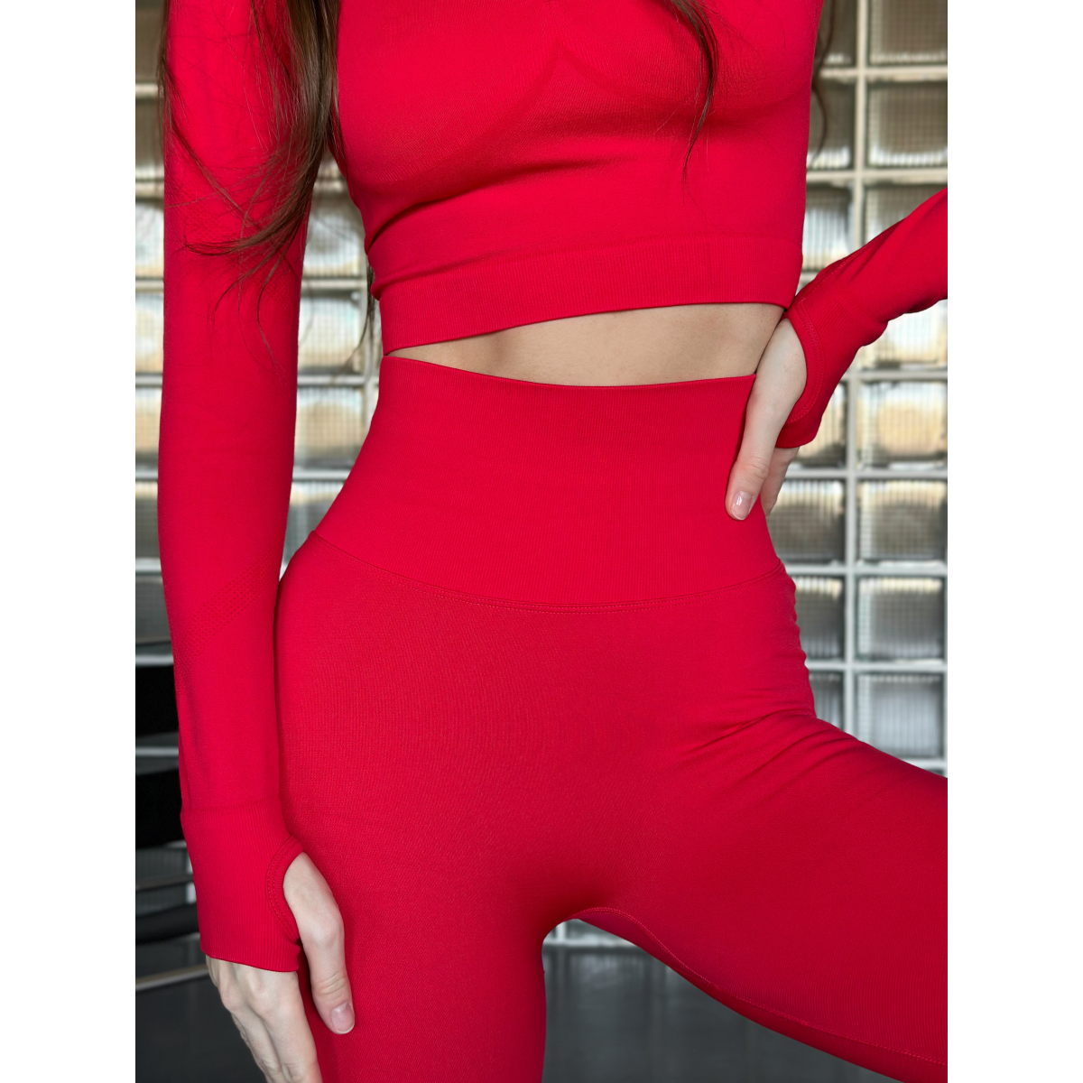 Безшовний комплект спортивний лосини з подвійним push up і топ лонгслів без чашок червоний Rise
