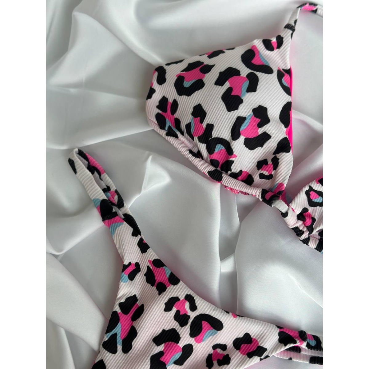 Роздільний білий леопардовий купальник стрінги ліф на зав“язках