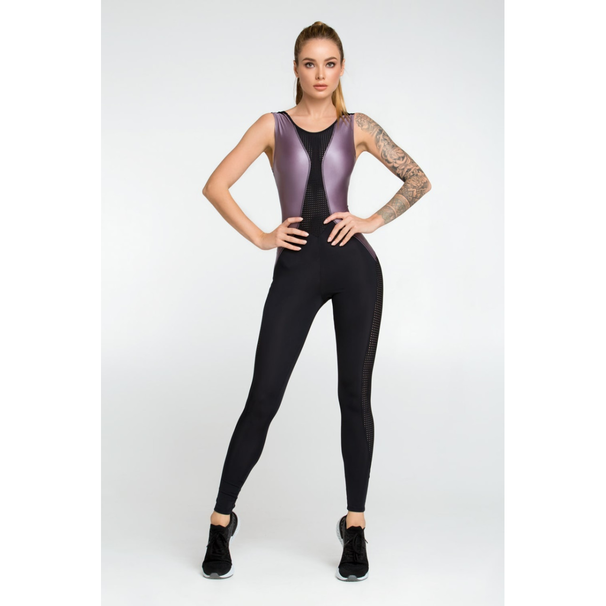 Обтислий комбінезон виготовлений з еластичного матеріалу для абсолютної свободи рухів. Тканина з компресійним ефектом забезпечує підтримку під час інтенсивних навантажень. Дизайн комбінезона доповнений вставками з візуальним ефектом шкіри. На дотик ця тканина приємна до тіла та вирізняється м“якістю, зберігаючи всі функціональні особливості. А перфоровані вставки забезпечують додаткову вентиляцію й підкреслюють силует. Ідеально підходить для занять у тренажерному залі, танців, фітнесу та інших активних видів спорту.