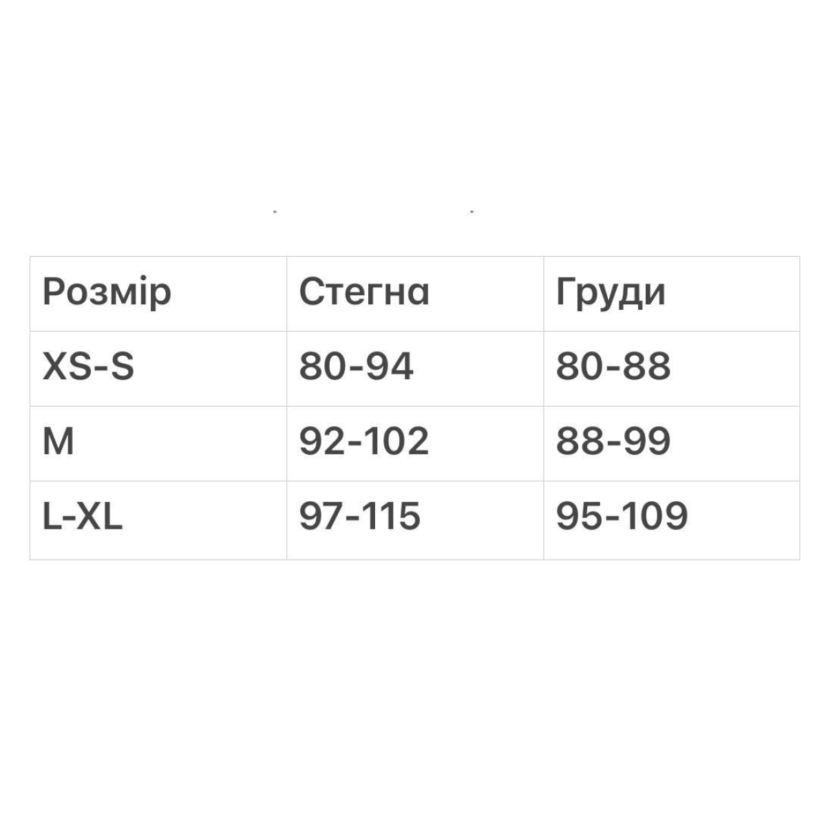 • L — талія 70–78 см / стегна 94–100 см / довжина 90 см