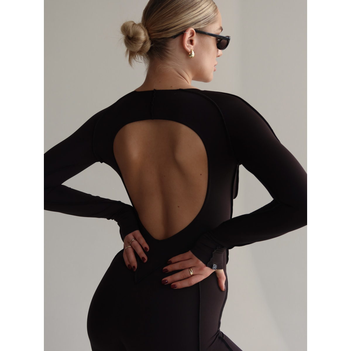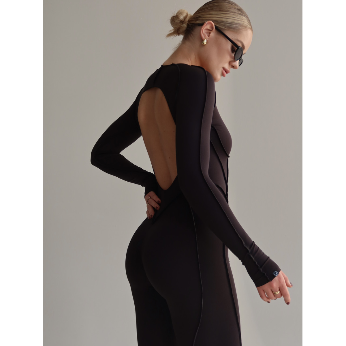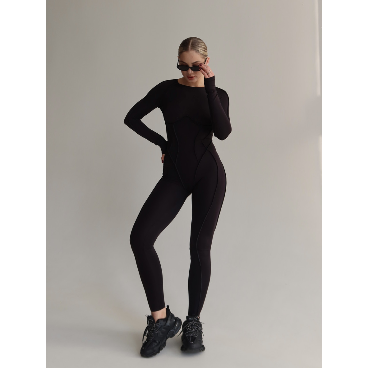 Моделюючий комбінезон чорного кольору з відкритою спиною та зовнішніми швами.