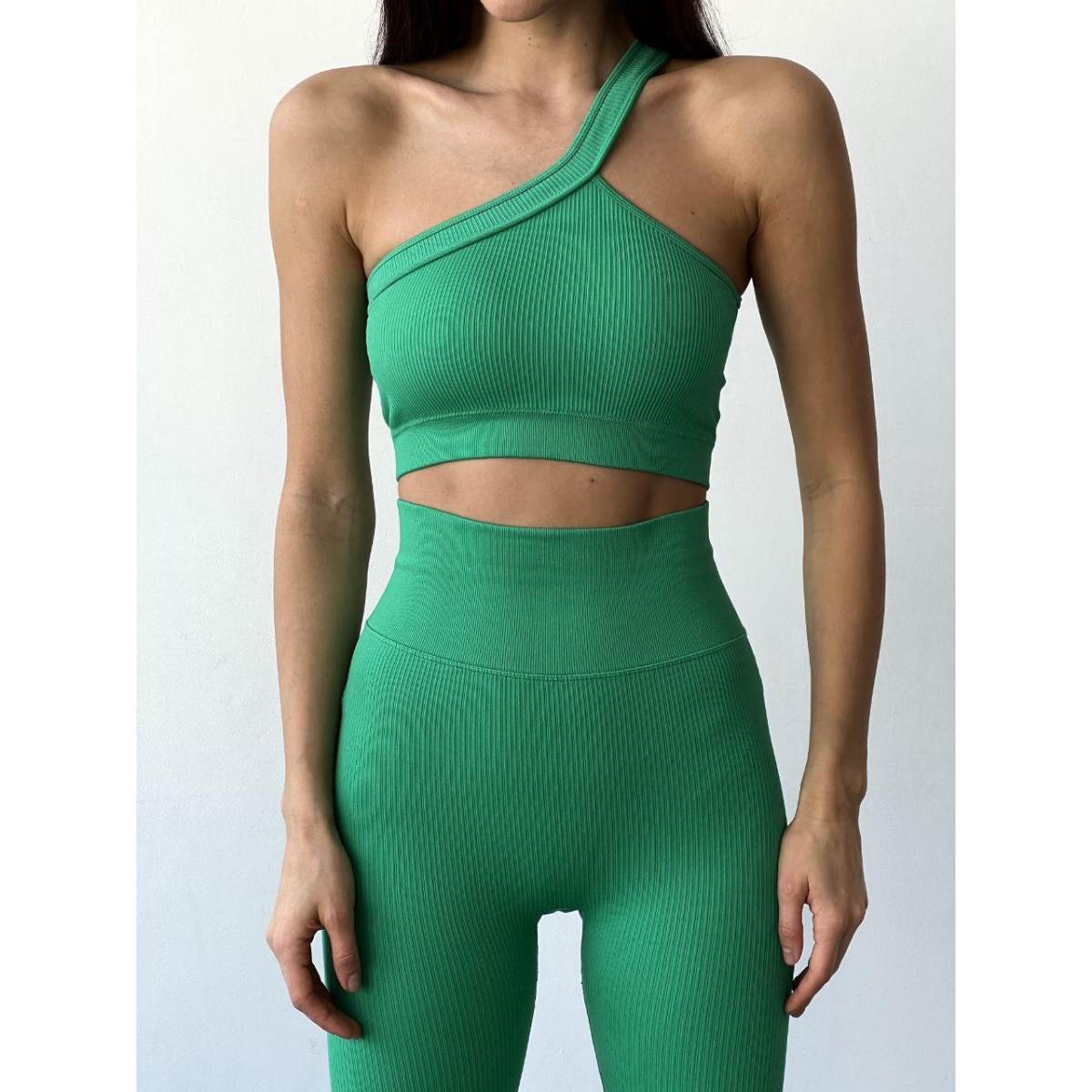 Push up комплект в рубчик топ бра на одне плече і лосини легінси зелений