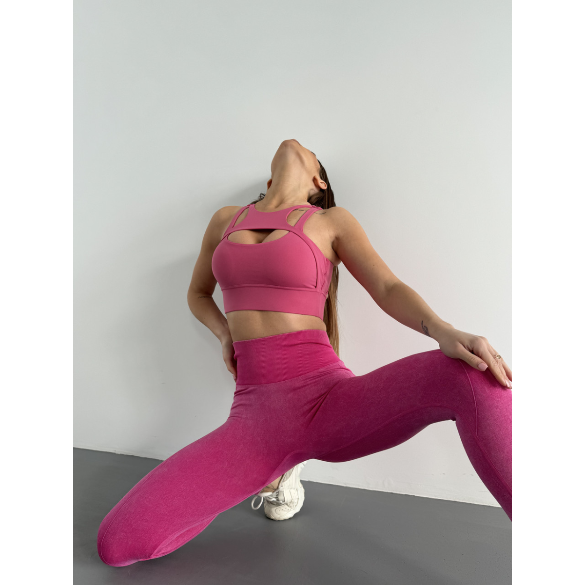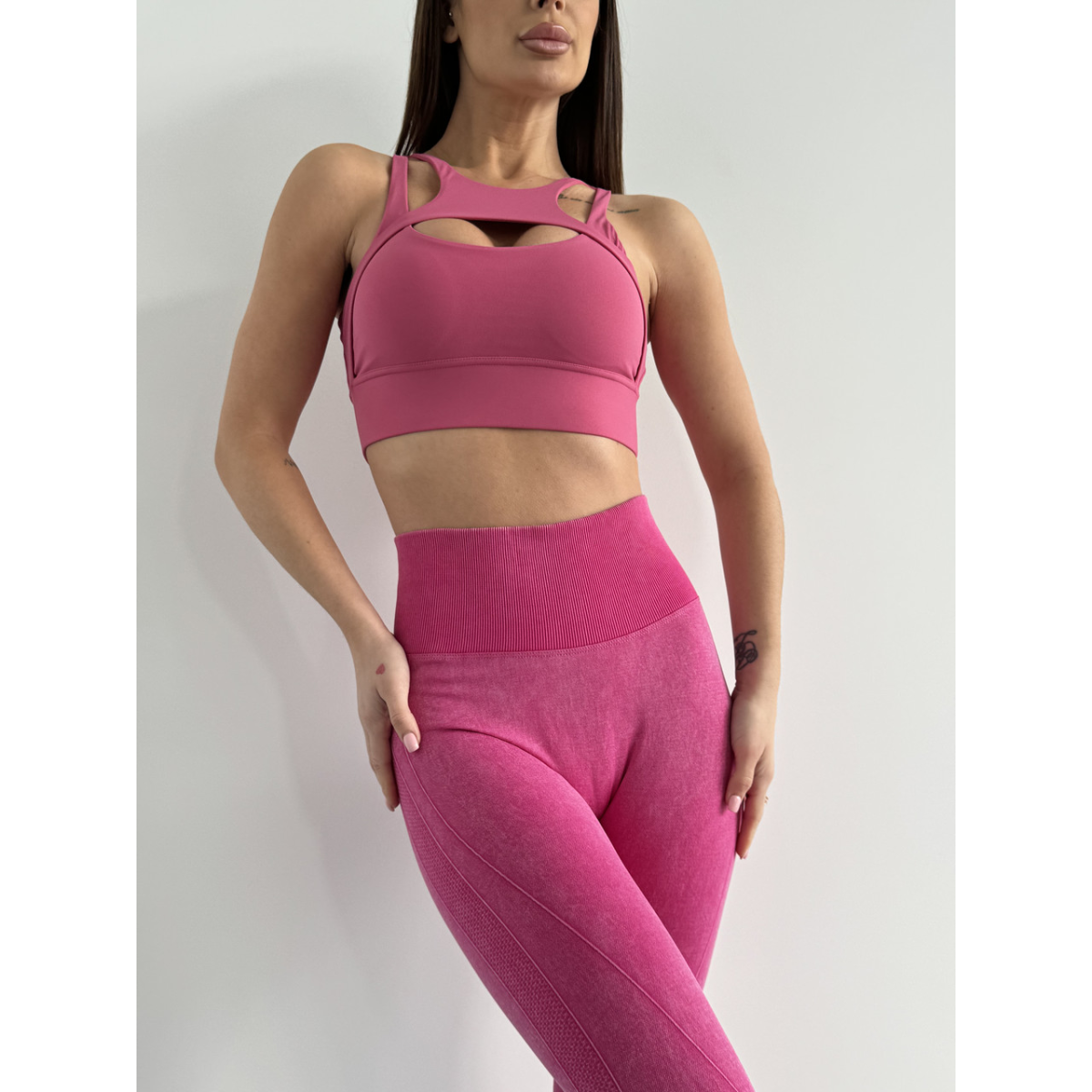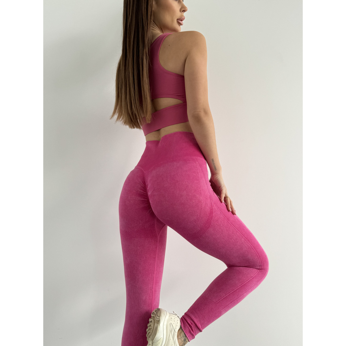 Трендова виварена тканина в 10 кольорах. Перфорація для кращої вентиляції під час активностей вздовж всієї ніжки подовжує силует. Подвійний Push up візуально додає об єму, а V-подібний шов робить округлу форму сідничок від самого верху. Комфортна до тіла, м'яка еластична тканина, але при цьому чудово підтягує.