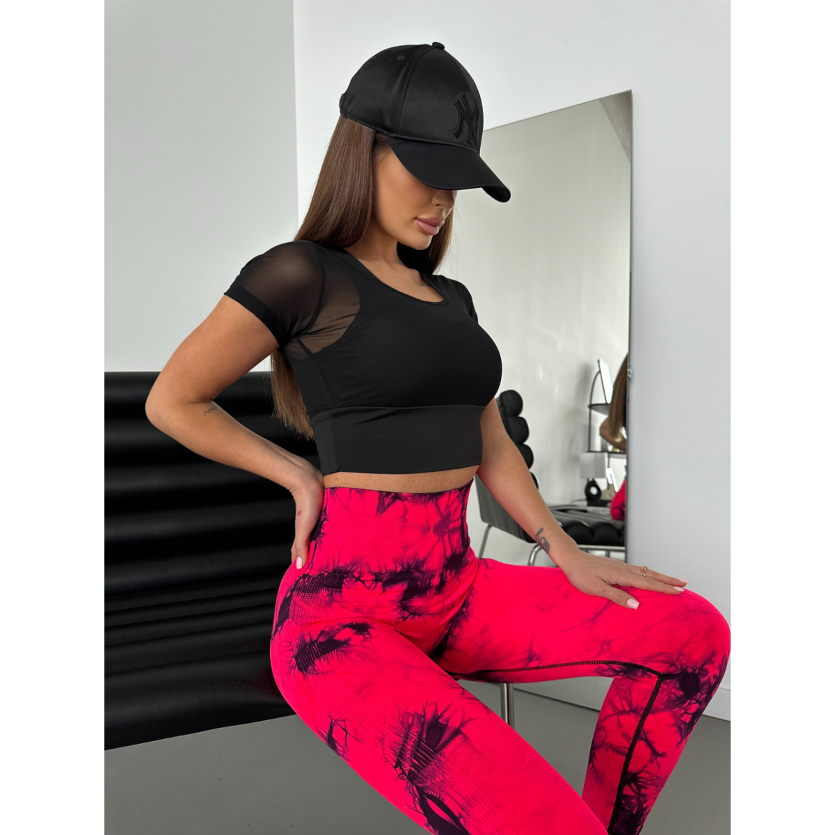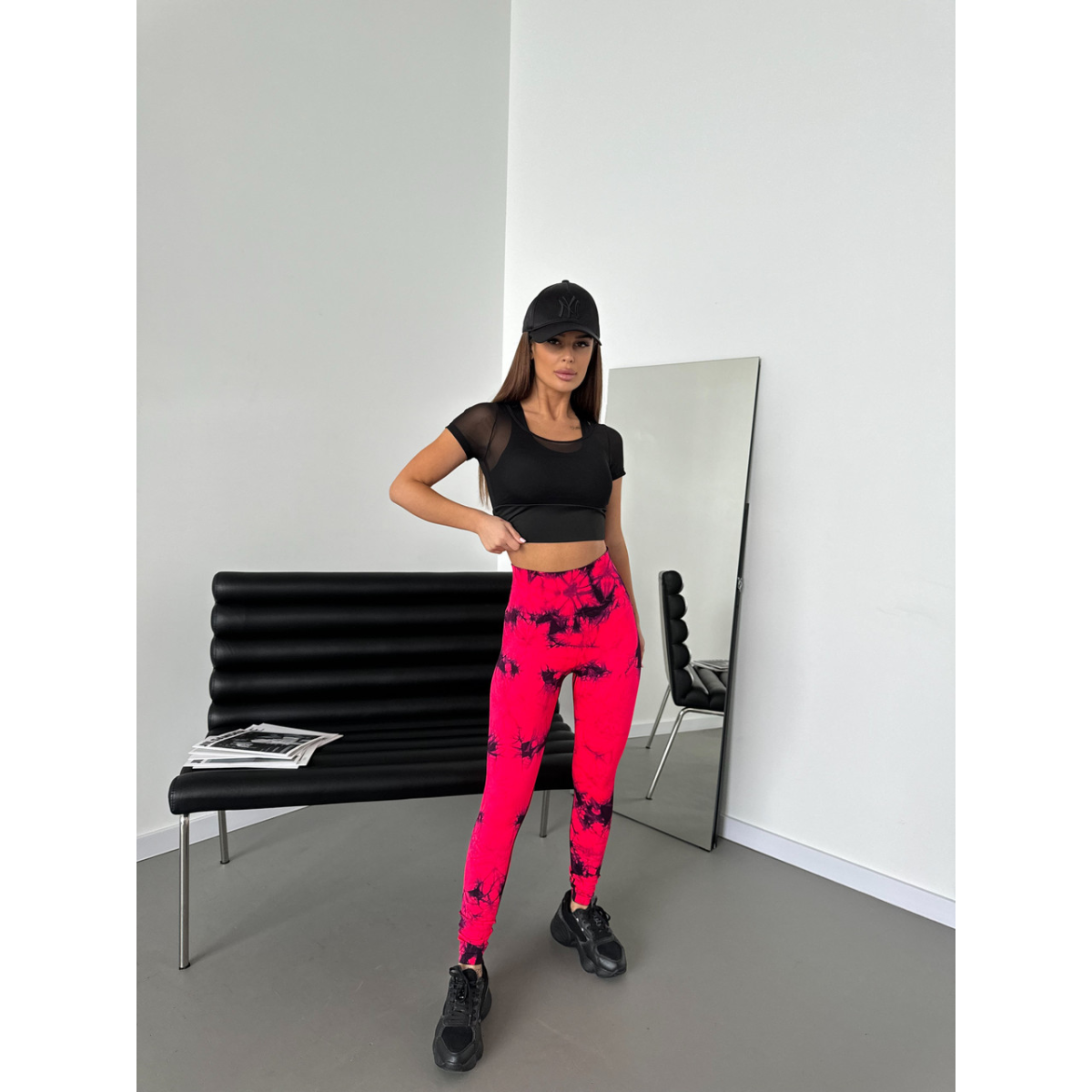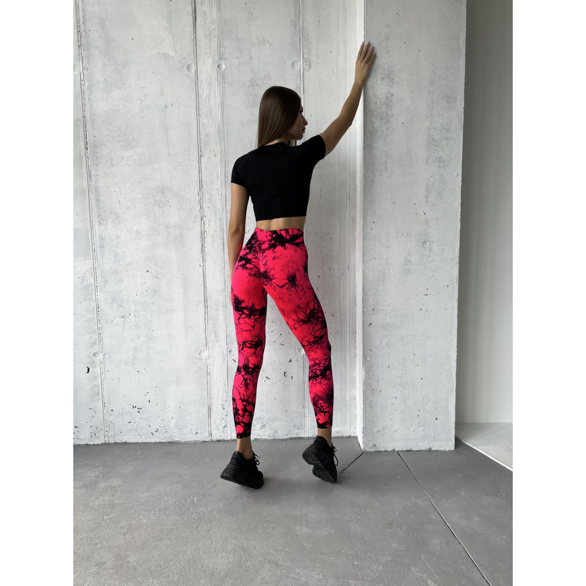 Спортивні легінси пушап жіночі мармурові димок червоні з чорним